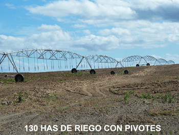 Construcciones: Cuenta con 5 Pivotes centrales habilitados, los que abarcan 130 Has y 3 Carretes de riego auto-envolventes para 80 Has también habilitadas. Hay otras 200 Has que no tienen implementado Pivotes ni Carretes, que se arriendan a menor valor y es conversable la implementación de Pivotes o Carretes y el beneficio de subsidio de la Ley de Riego.