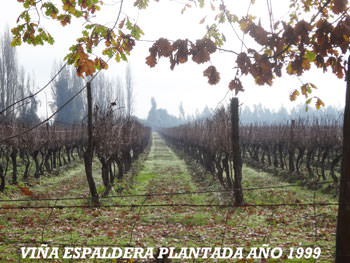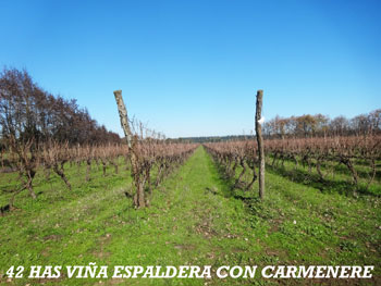 Características: El Predio es de una superficie de 225 Has, con 42 Has reales plantadas con Viñas en espalderas, variedad Carmenere, plantada año 1999 en plena producción, todo con Riego Tecnificado, 40 Has Limpias dedicado a cultivos de Alfalfa en 5 Has, Remolacha, Tomate industrial y 50 Has con renovales de Eucaliptus, resto de campo dedicado a Ganadería y sector de vegetación Nativa, factible de limpiarse y plantarse entero de frutales