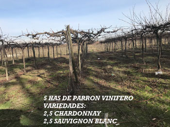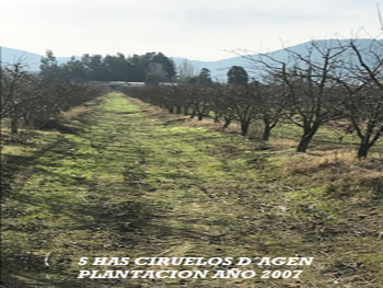 Se encuentra plantado con 5 Has de Ciruelos variedad D´Agen plantado año 2007 en plena producción con cosecha de 35.000 kg secos y 5 Has de Parrón vinífero con 2,5 Has de Chardonnay y 2,5 Has de Sauvignon Blanc plantado año 2007 con producción de 125.000 kg de uvas, todo con riego tecnificado y sistema de fertiriego y con doble línea de goteros.