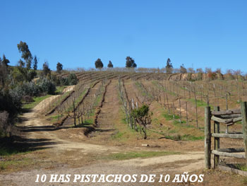 Características: Es un predio de Lomajes suaves plantado con 10 hectáreas de Pistachos con variedad Alfoncigo, plantados año 2008 y ya entrando en producción importante.