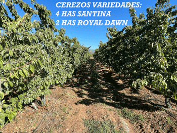 Características: Es un lindo campo de 77 has. de suelos planos de riego en 47 hectáreas y 30 Has de cerro con abundante vegetación nativa, dedicado en la actualidad a 6 Has de Cerezos en producción, variedades SANTINA en 2 Has y 2 Has de ROYAL DAWN, ambas con Cobertores de Techo, plantados año 2009 y 2 Has con SANTINA plantada año 2011 con producción de 80.000 kg. en total.