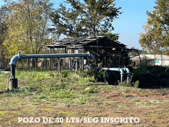 Derechos de Agua: El campo cuenta con agua suficiente para el riego del predio, consistente en 1 Pozo profundo con 40 Lts/seg debidamente inscritos (requiere mantención) y además, en el extremo oriente existe pozo zanja cuyo caudal es de 100 Lts/seg.